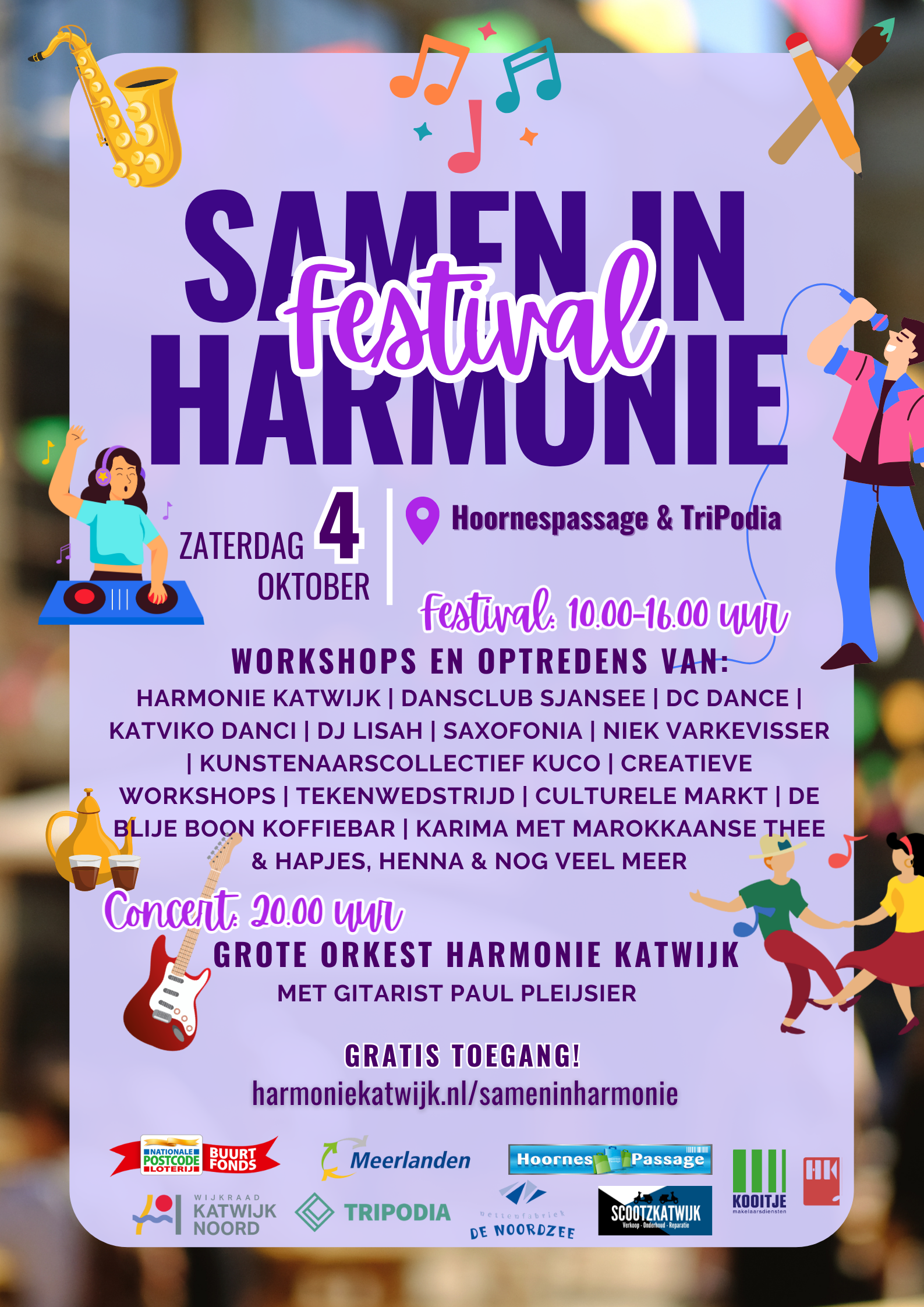 Op zaterdag 4 oktober staat Katwijk in het teken van muziek, dans, kunst en ontmoeting tijdens het jaarlijkse festival “Samen in Harmonie”. Dit jaar vindt het festival plaats in de Hoornespassage en Tripodia. Het programma is gevarieerd en biedt voor iedereen iets leuks: van optredens en workshops tot een culturele markt en kinderactiviteiten.