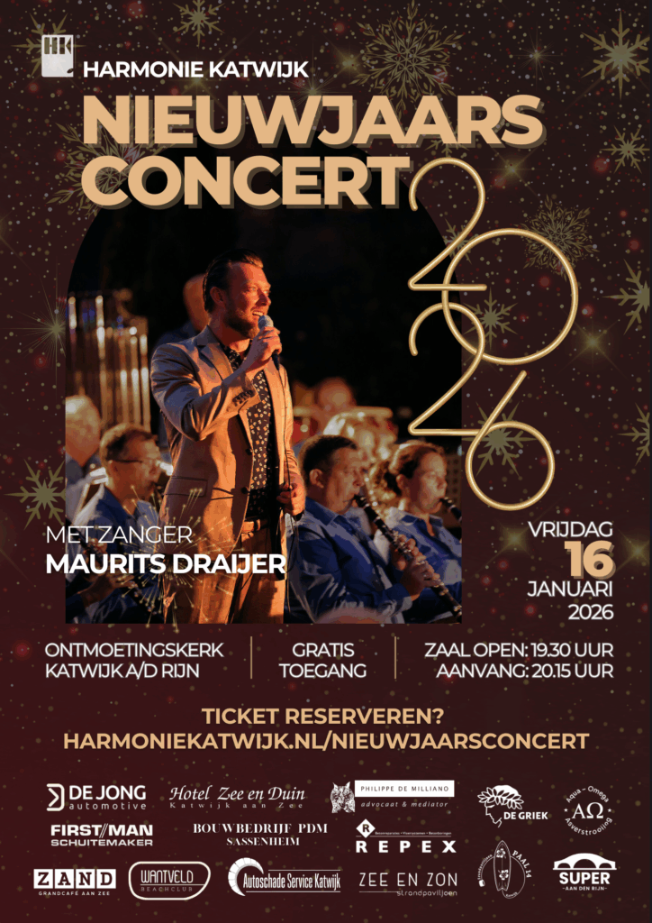 Muziekvereniging Harmonie Katwijk luidt het nieuwe jaar feestelijk in met een gratis toegankelijk nieuwjaarsconcert op vrijdag 16 januari in de Ontmoetingskerk. Het orkest treedt deze avond op samen met zanger Maurits Draijer, wat zorgt voor een warme en afwisselende muzikale mix.