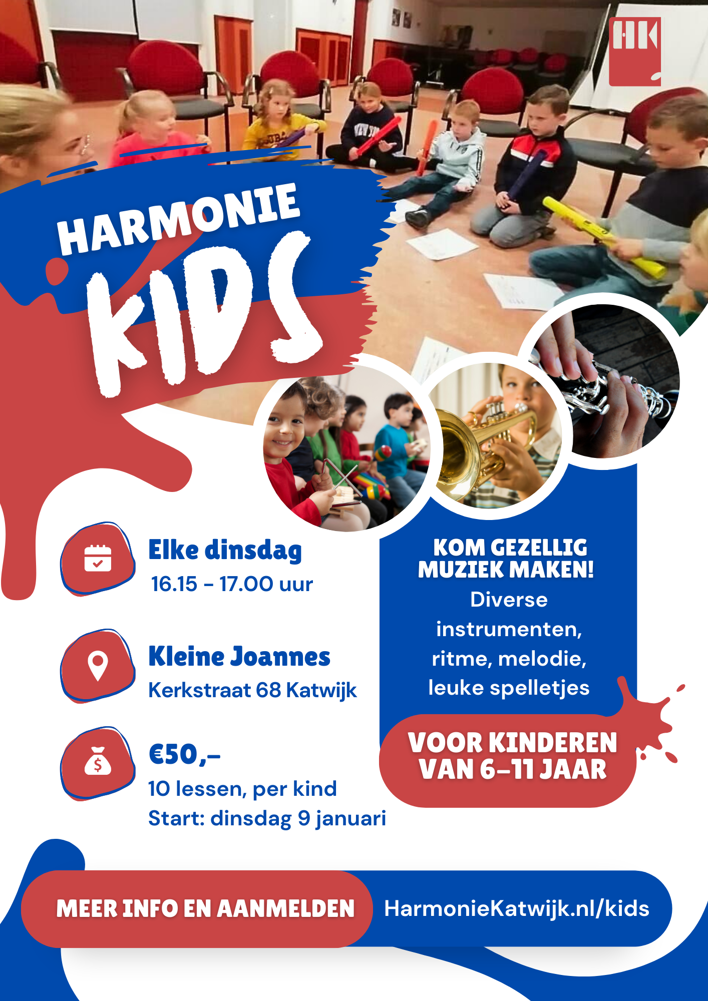 De repetities van Harmonie Kids vinden plaats in de ‘Kleine Joannes’, Kerkstraat 68 in Katwijk aan den Rijn. De totale kosten voor deze 10 muzieklessen zijn €50,- en aanmelden kan via www.harmoniekatwijk.nl/kids of door te mailen naar kids@harmoniekatwijk.nl.