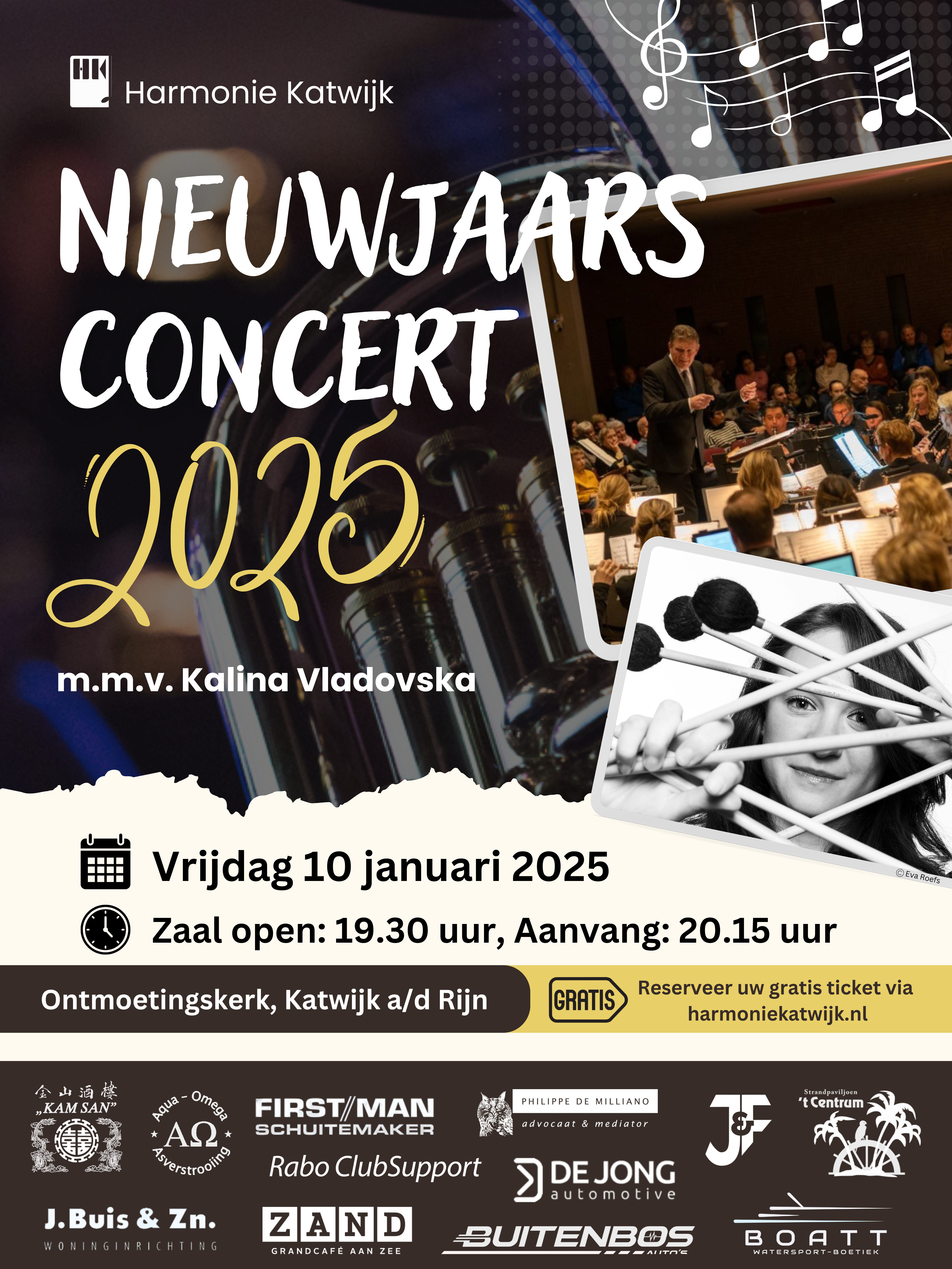 Op vrijdag 10 januari nodigt muziekvereniging Harmonie Katwijk iedereen uit voor het jaarlijkse nieuwjaarsconcert in de Ontmoetingskerk. Dit jaar heeft het concert een bijzonder accent, want de getalenteerde percussioniste Kalina Vladovska zal als solist optreden. Het belooft een dynamische en inspirerende avond te worden, vol verrassende klanken en muzikale hoogtepunten!